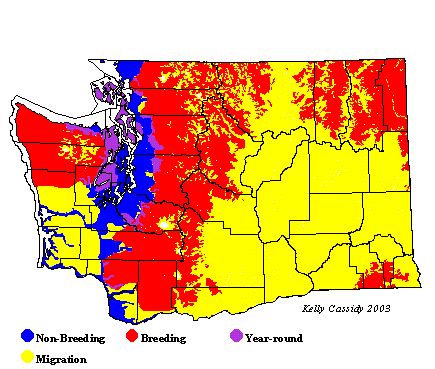 From May through September, Townsend's Warblers are common in appropriate habitat in western Washington and at higher elevations throughout the state, although they are uncommon on the Olympic Peninsula. Townsend's Warblers winter uncommonly in western Washington lowlands. Townsend's Warbler'Hermit Warbler hybrids are common around Mount Adams and Mount St. Helens and the east slopes of the Olympic Mountains.
